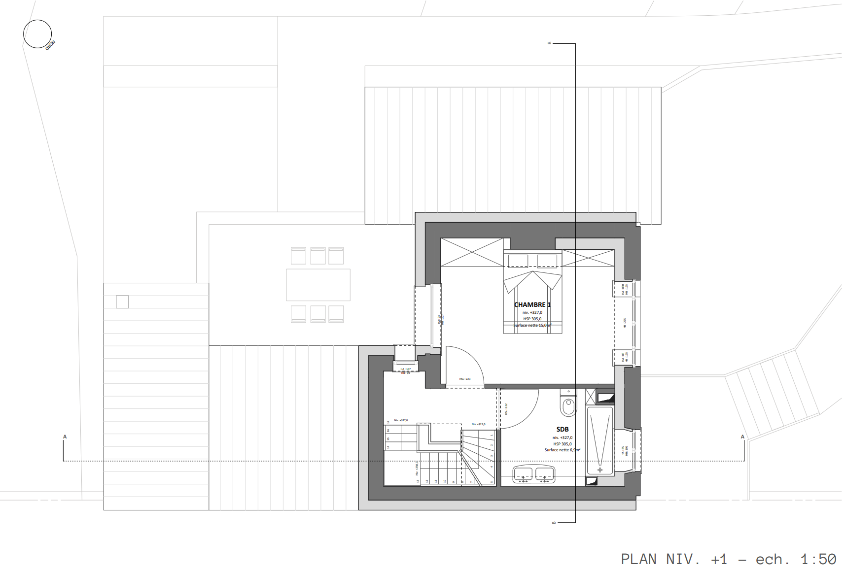 La seconde annexe permet la création de l'atelier de joaillerie, mais est pensée pour pouvoir accueillir une salle de bains. En effet, le projet a été pensé pour être évolutif. Dans un futur ou les occupants désireraient une maison de plain-pied, le bureau est prévu pour devenir une chambre, avec une porte vers la salle de bain à l'aide d'un linteau en attente.